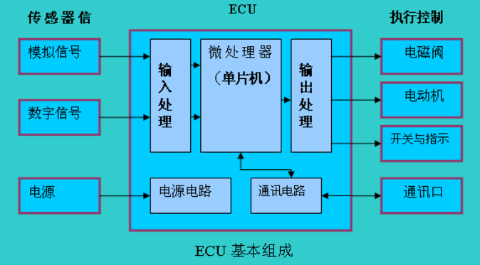 简单地说,ECU由微机和外围电路组成。而微机就是在一块芯片上集成了微处理器(CPU),存储器和输入/输出接口的单元。ECU的主要部分是微机,而核心部件是CPU。输入电路接受传感器和其它装置输入的信号,对信号进行过滤处理和放大,然后转换成一定伏特的输入电平。从传感器送到ECU输入电路的信号既有模拟信号也有数字信号,输入电路中的模/数转换器可以将模拟信号转换为数字信号,然后传递给微机。微机将上述已经预处理过的信号进行运算处理,并将处理数据送至输出电路。输出电路将数字信息的功率放大,有些还要还原为模拟信号,使其驱动被控的调节伺服元件工作。,例如继电器和开关等。因此,ECU实际上是一个“电子控制单元”(Electronic Control Unit),它是由输入处理电路、微处理器(单片机)、输出处理电路、系统通信电路及电源电路组成,的结构如图1所示。