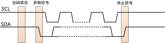 1、初始状态 (即空闲状态):SDA与SCL均为上拉电阻所致的高电平时为初始状态;2、开始信号 :当SCL为高电平的时候,SDA被拉低,此为开始信号,表明通讯开始。 3、终止信号 :当SCL为高电平的时候,SDA被拉高,此为终止信号,表明本次通讯结束。