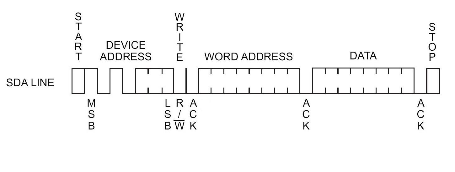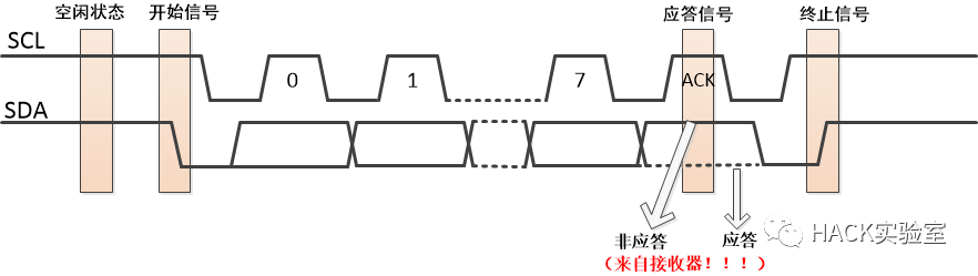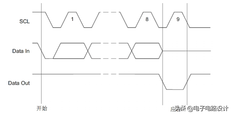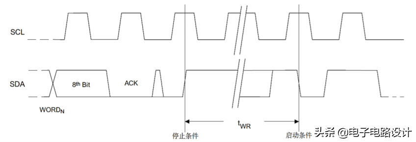 所有地址和数据字均以8bit字连续传输到EEPROM,EEPROM发送一个"0"来应答,以确认它已收到每个字。应答发生在第九个时钟周期如图所示。