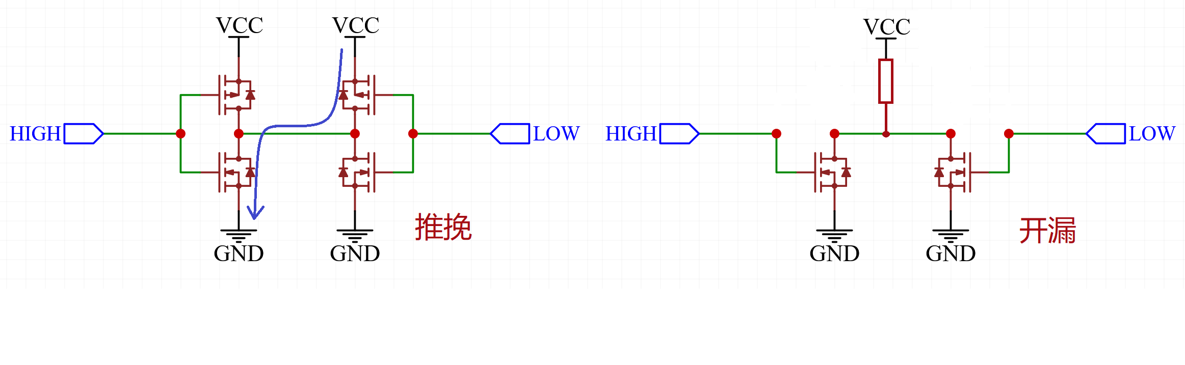 3、关于两线为什么设计成开漏 ,这个问题我记得我之前在写《STM32单片机I/O的8种工作模式》时给大家埋下过伏笔。今天就来说一下具体原因。主要有两点①防止短路:大家想想如果不设为开漏,而设为推挽,几个设备连在同一条总线上,这时某一设备的某个IO输出高电平,另有一台设备的某一个IO输出低电平,这时你会发现这两个IO的VCC和GND短路了;但是开漏就不会有这个问题,如下图示: