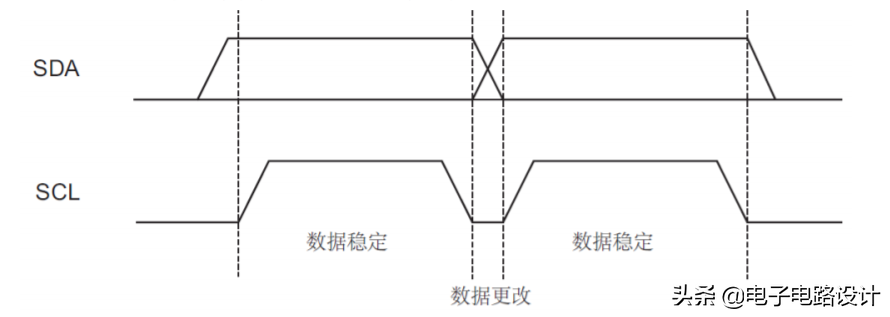 SDA引脚通常使用外部设备拉高。SDA引脚上的数据只能在SCL为低电平时进行更改,SCL为高电平时数据更改将指示开始或停止条件。如图所示。