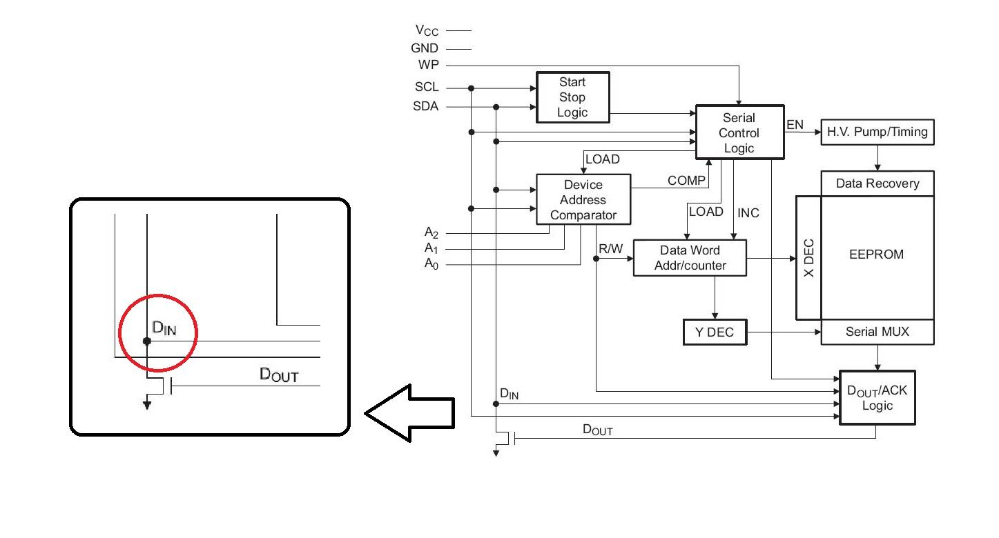 第二个原因是“线与”,我们想个场景:如果总线上的一个A设备将SDA拉高,这时总线上另一个B设备已将SDA拉低,这时由于1&0=0,所以A设备检查SDA的时候会发现不是高电平而是低电平,这就表明总线上已经有其他设备占用总线了,A只好放弃,如果检测是高电平那就可以使用。如下图示为24C02芯片内部图,可以看到状态检测脚。