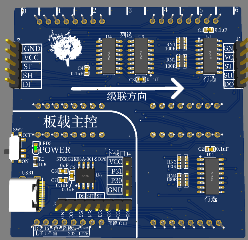 使用STC8G1K08A-SOP8单片机作为主控芯片,使用4个74HC595芯片驱动点阵,TYPE-C口进行供电,需要自备USB-TTL下载器进行程序下载。