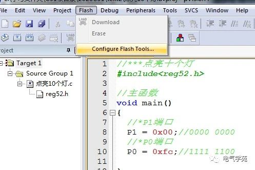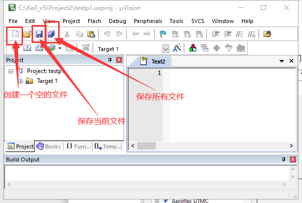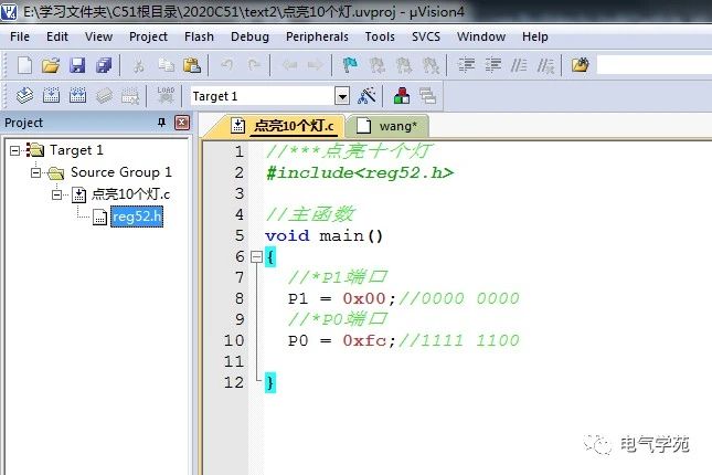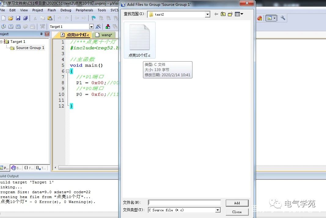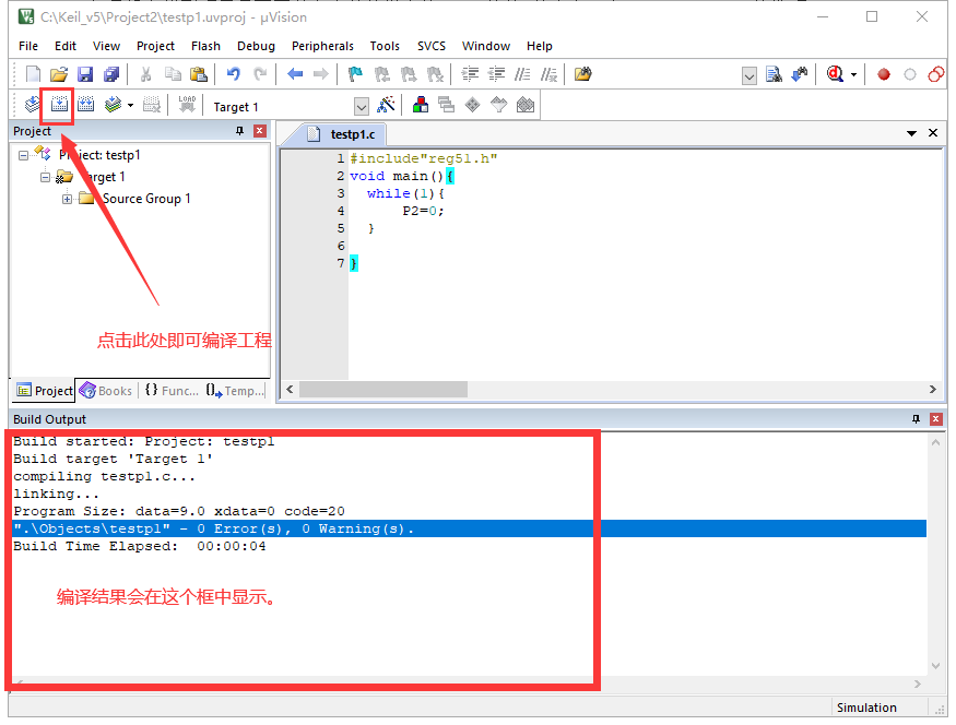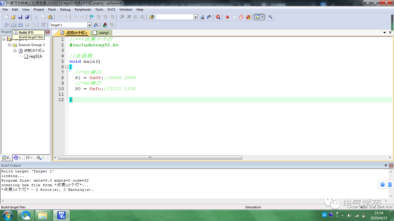 点第三行第二个,编译,如果程序写的没语法错误,下方会提示0错误0警告,并输出HEX文件。