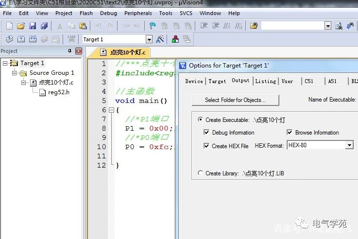 打开后,我们要设置一个,输出,选中HEX那个选项。以后每次建工程,都要重新选中这一项,因为下载单片机,需要生成这个文件才能下载。