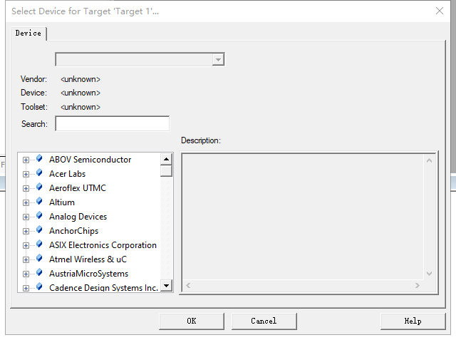 工程创建过后会弹出窗口,让我们选择芯片的型号,这需要根据开发板所使用的CPU型号来选择,如果不知道应该选什么,建议大家自行查找答案。