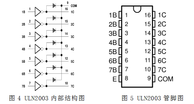 驱动模块我们使用集成驱动芯片ULN2003,给芯片是高耐压、大电流达林顿管由七个硅NPN 达林顿管组成。该电路的特点如下:ULN2003 的每一对达林顿都串联一个2.7K 的基极电阻,在5V 的工作电压下它能与TTL 和CMOS 电路直接相连,可以直接处理原先需要标准逻辑缓冲器来处理的数据。ULN2003 工作电压高,工作电流大,灌电流可达500mA,并且能够在关态时承受50V 的电压,输出还可以在高负载电流并行运行。1脚输入,16脚输出,你的负载接在VCC与16脚之间,不用9脚。