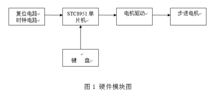 如下图,整个设计以STC89C51单片机为中心,由复位电路,时钟电路,电机驱动,步进电机,显示电路等组成,硬件模块如图2-1所示: