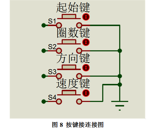 设计中,键盘采用非编码键盘系统中的独立式按 键结构。键盘工作方式采用定时扫描方式。采用定时 器TO定时,通过输出数据,识别按键的工作状态。键 盘主要用来提供人机接口,电路如图3所示,采用独立 式按键电路,各按键开关均采用了上拉电阻,保证在按 键断开时,各I/O有确定的高电平。按键功定义如 下:当P3.2按下时,步进电机开始加速;当P3.3按下 时,步进电机开始减速;当P3.4按下时,步进电机开始 正转;当P3.5按下时,步进电机开始反转。按键抖动的消除采用软件消抖实现。连接图如下:
