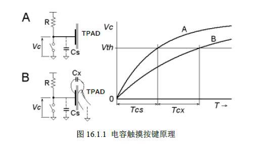 其实,电容触摸按键的检测原理说起来也十分简单,即RC充电时间的变化实现的,其中最根本的原因是电容容量的变化。在周围环境,不变的情况下,键盘和大地之间的电容是一个很微小的固定值,而人体和大地之间也存在着电容。当手指靠近触摸按键时,就相当于触摸按键与大地之间的电容并联了人体与大地之间的电容,从而使总电容容量变大。