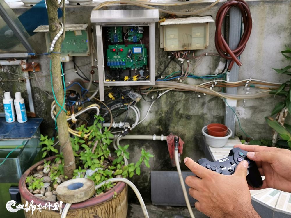 大师从柜子里拿出一个PS2无线手柄,演示这些功能。按三角键,树上的彩灯亮了。按方块键,草丛里传出音乐。按圆圈键,鱼缸的遮雨棚缓缓落下。像玩游戏。