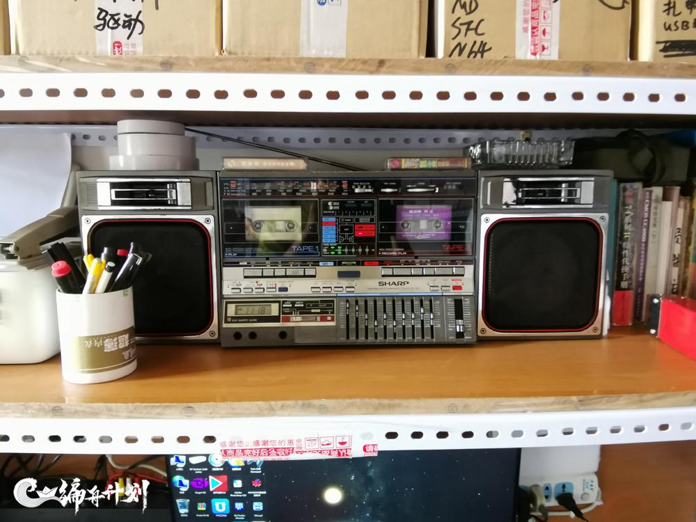 这是夏普GF-800,上世纪八十年代的经典机型,大师介绍。很多年前,他从收荒匠那里把它捡了回来,擦干净修好。他工作的时候,这台收录机就一直开着,放磁带放广播放李伯清的评书,如同一位老友在耳边喋喋不休。