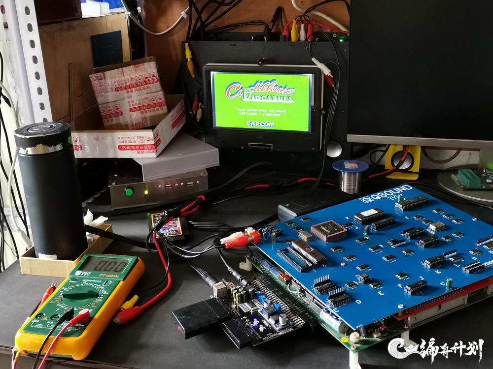 大师的下一个目标是CPS家用机,“搞出来的话,可能会轰动”。大师从柜子里取出一块CPS基板,上面扣着红色的游戏ROM板。另有一块印着“QSOUND”字样的蓝色电路板,是他自己做的。