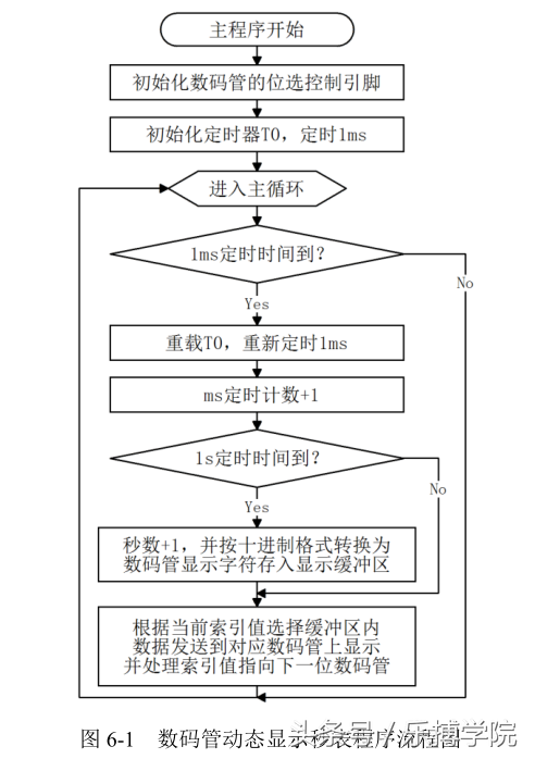 我们的目标还是实现秒表功能,只不过这次有 6 个位了,最大可以计到 999999 秒。那么现在要实现的这个程序相对于前几章的例程来说就要复杂的多了,既要处理秒表计数,又要处理动态扫描。在编写这类稍复杂的程序时,建议初学者们先用程序流程图来把程序的整个流程理清,在动手写程序之前先把整个程序的结构框架搭好,把每一个环节要实现的功能先细化出来,然后再用程序代码一步一步的去实现出来。这样就可以避免无处下笔的迷茫感了。如图 6-1 就是本例的程序流程图,大家先根据流程图把程序的执行经过在大脑里走一遍,然后再看接下来的程序代码,体会一下流程图的作用,看是不是能帮助你更顺畅的理清程序流程。