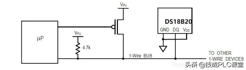 1-Wire线端口为漏极开路构或三态门的端口,因此一般需要加上拉电阻Rp,通常选用5K~10KΩ