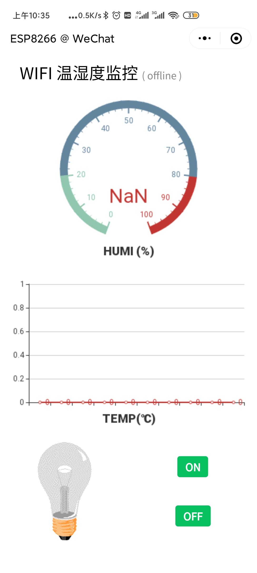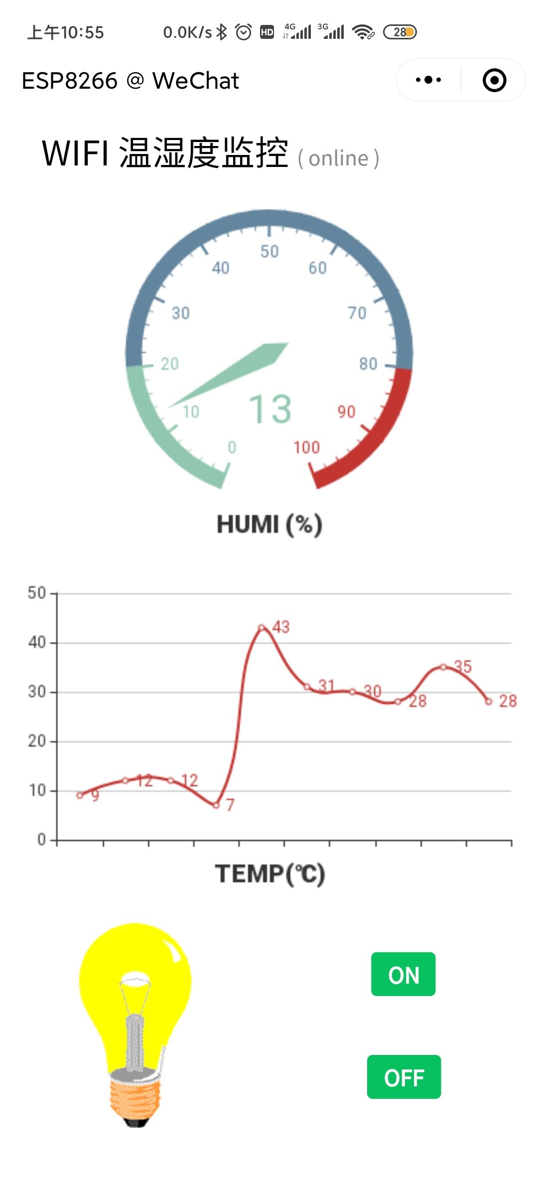 温湿度的数据是假的,不过确实是esp8266发过来的随机数据。on,off 是实时控制led灯的,小程序中灯泡是实时显示led 的状态的,我拍了15秒的演示显示,大家可以去我的微头条看看。