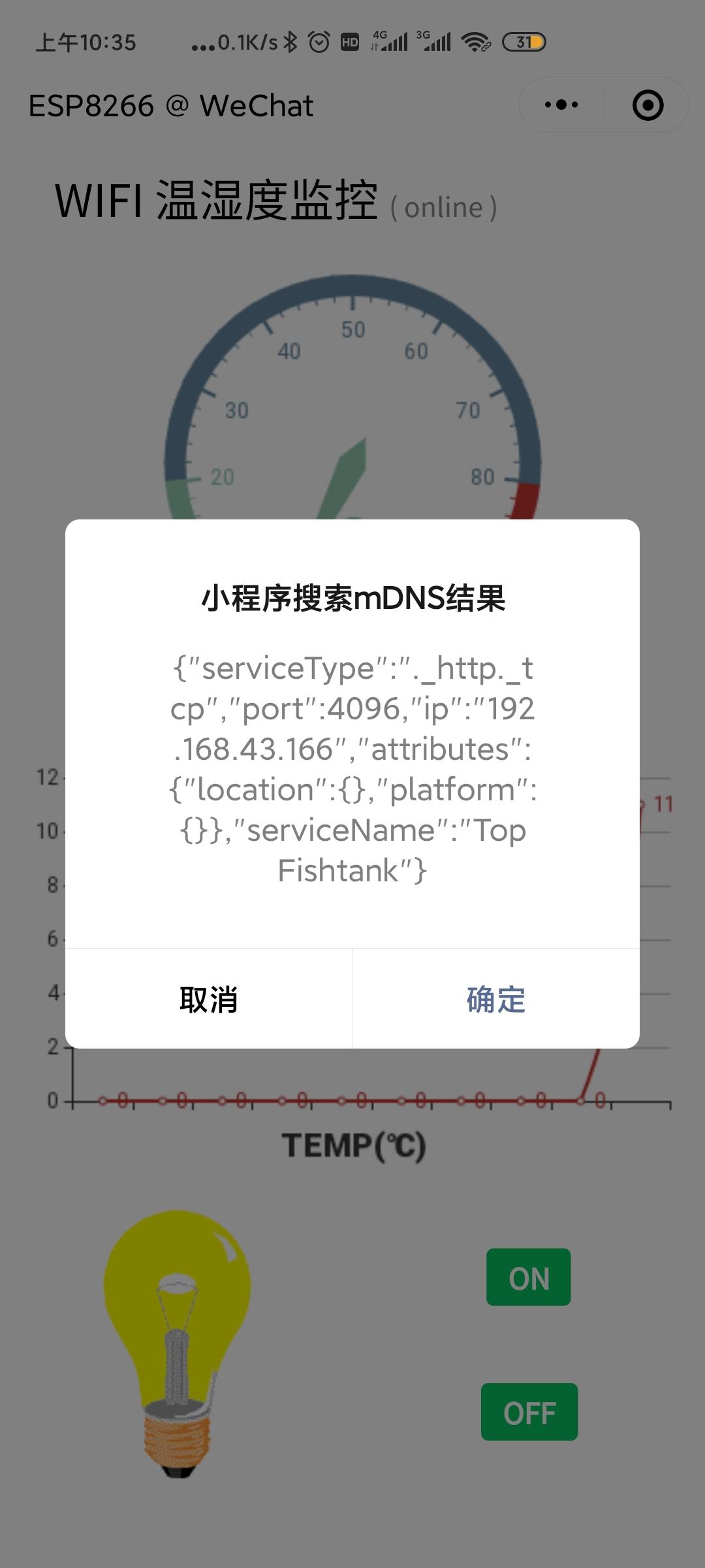 刚刚打开的时候,小程序还没有和esp8266连接,所以显示设备是offline,这个时候,小程序下拉一下,开启搜索mDNS服务,便可找到esp8266,如下图: 返回的数据有esp8266的ip和port,小程序同时往这个ip,port发送打招呼信息,esp8266接收到信息,找到小程序的ip,port,最后设备不停的往小程序上报数据。