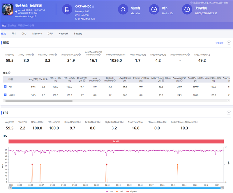 结果如上所示,平均帧59.5帧,平均帧时间也只有16.8ms,全程绝大部分的帧数都是很流畅的。从上面四款热门手游的表现来看,使用麒麟990处理器的荣耀Play4 Pro手机游戏性能毫无压力,最高画质+分辨率下不仅仅是流畅,而是全程满帧运行,帧数波动非常小,无压力征服目前主流手游。