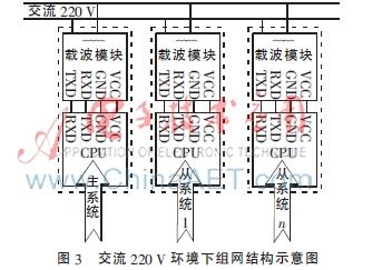 系统具体采用HL-PLC V3.0载波通信模块对信号进行调制,使得信号能在电力线中传输。该模块采用FSK通信方式,软件采用模糊算法,即使传输信号被干扰或丢失达40%,也能较准确地还原出原载波信号,抗干扰能力较强。载波中心频率为72 kHz,模块可在过零发送模式和正常发送模式间自由切换。正常模式下传输速度快,但抗干扰能力弱,适合负载轻、干扰少的线路环境;过零模式速度稍慢,抗干扰能力强,适合绝大多数线路环境。本文设计的系统采用过零模式,如图3为交流220 V环境下的组网结构,该结构下无需架设专门的通信电缆,安装方便,抗干扰能力强,通信距离远,比较适于复杂多变的电网环境[7]。