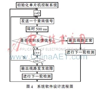 软件设计采用C语言编写单片机程序,实现端到端的线路的单线测试。即控制端的单片机发送检测信号到载波模块,通过载波模块的调制作用,将信息加载到220 V的电力线上,在接收端,信号通过载波模块的解调后将信息发送到接收模块。低压电力线上存在着噪声干扰,电压、电流不稳定等不确定因素[8],因而会在线路正常的情况下,出现控制端无法收到反馈信息的情况,从而对线路状况误判。因此每次线路查询,需多次发送进行验证,以排除由于干扰而引起误判的可能性。经实际测试分析得到:每一轮查询,连续发送多次信号,即可排除线路干扰引起的错误判断;考虑到信号的发送与接收需要时间,因此每次发送的信号之间需要间隔一段延时。经实际测试得到:从控制端向接收端发送信号到接收端返回信号给控制端,这个过程所需要的时间为500 ms,因此延时时间设定为500 ms。