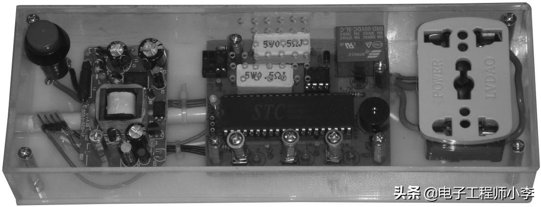 (4)把电路板、开关等固定在插线板里,接好线,即完成了系统的制作,其接线图如图6.12所示,每次按触动开关,系统自动启动,并保持通电状态。当给饮水机断电时,系统电源也跟着断电,节省电能的同时,也防止系统长时间通电而影响其寿命。制作完成的作品如图6.13所示。