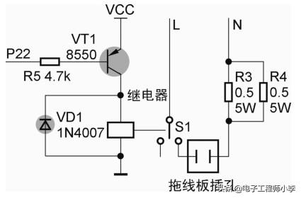 控制系统通过继电器控制是否给饮水机通电,如图6.5所示。当P22输出高电平时,VT1导通,继电器触片接到常开引脚,接通饮水机的电源。反之,则关闭饮水机的电源。由于继电器是感性元件,断电时将产生较高的感应电动势,所以要接上一个二极管(IN4007)作为续流二极管,吸收所产生的感应电流。此处使用的继电器额定电流为10A,完全适合此制作的需要。