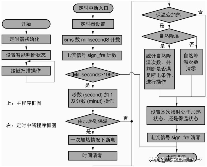 根据系统的工作过程,设计出单片机程序的流程,如图6.6所示。其主要的控制部分在定时中断里完成,而按键扫描,则在主程序里完成。