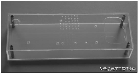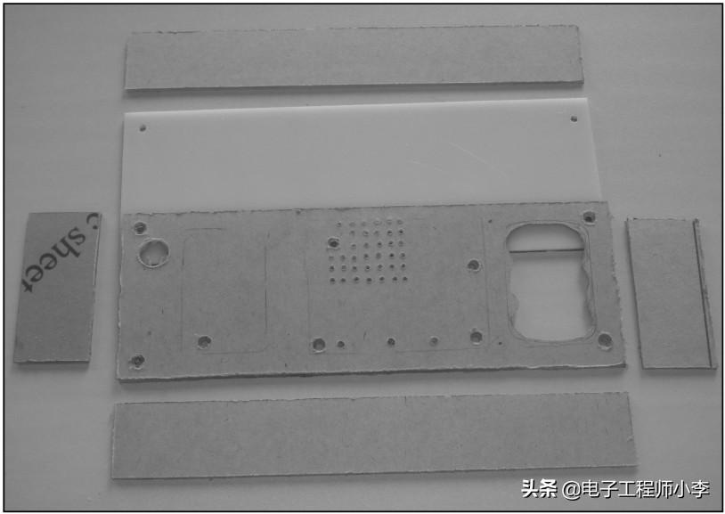 (2)由于控制器涉及220V的高压电,因此必须制作一个外壳,把里面的电路包装起来。我们选用的是加工性能好、透明度高的亚克力板(有机玻璃板),在保护里面电路的同时,不至于把我们制作的精华部分隐藏起来。为使系统更协调,底板采用乳白色的亚克力板。根据设计,裁取合适的6块板,并在面板上相应的位置加工相关的孔,如散热孔、安装孔、按键孔、插座孔等。加工好的几块板如图6.9所示,再用亚克力板专用胶水把各部分粘连起来,如图6.10所示。