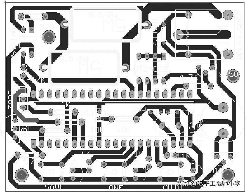 (1)根据设计的原理图绘制PCB图,利用热转印法手工制作电路板。设计PCB时要充分考虑安装的空间、形状、关键元器件的位置,设计好的PCB如图6.7所示,安装好相关元器件之后的电路板如图6.8所示。