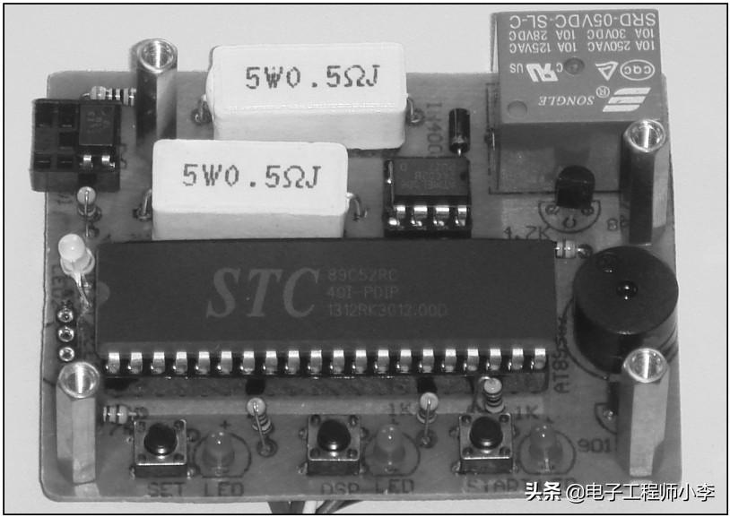 另一个3mm共阳双色发光二极管用于指示系统工作状态,发红色光表示饮水机处于加热状态,发绿色光表示饮水机处于等待状态。由于红色LED正常工作电压降约为1.7V,绿色LED正常工作电压降约为3V,所以为了获得相同的亮度,它们要连接不同的限流电阻。本制作中,红色LED串联1kΩ电阻作为限流电阻,绿色LED串联200Ω作为限流电阻,这使得它们的亮度能基本一致。安装二极管时要特别注意引脚的极性。