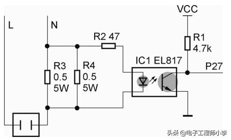 此处的取样电阻消耗的功率约为6W,所以选用两个功率为5W的水泥电阻并联使用,光耦选用常用的线性光耦EL817,它不仅实现了信号的耦合,同时也实现了系统与市电的的隔离,提高了系统的稳定性。