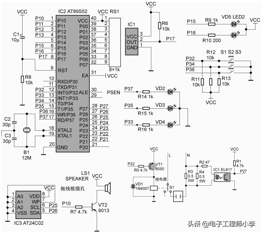 由于处理的数据不多,对处理速度要求不高,所以选用常用的51单片机作为主控单元,负责协调控制整个系统的工作,包括电流检测、时间测量、按键扫描、220V高压输出控制等相关操作,整个系统就是通过主控电路把各部分电路结合成一个有机整体的。