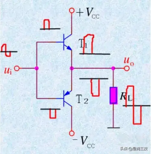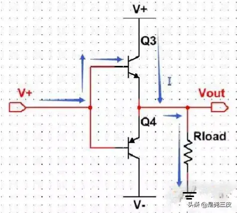 上面的三极管是N型三极管,下面的三极管是P型三极管,请留意控制端、输入端和输出端。当Vin 电压为 V+ 时,上面的 N 型三极管控制端有电流输入,Q3 导通,于是电流从上往下通过,提供电流给负载。