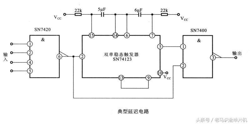 这是一个延迟电路,该电路中SN74123为双单稳IC,将终端设备的键控输出信号或其它的按键或继电器的输出信号进行延迟,延迟约为5毫秒以上,它可以消除按键触电的抖动。