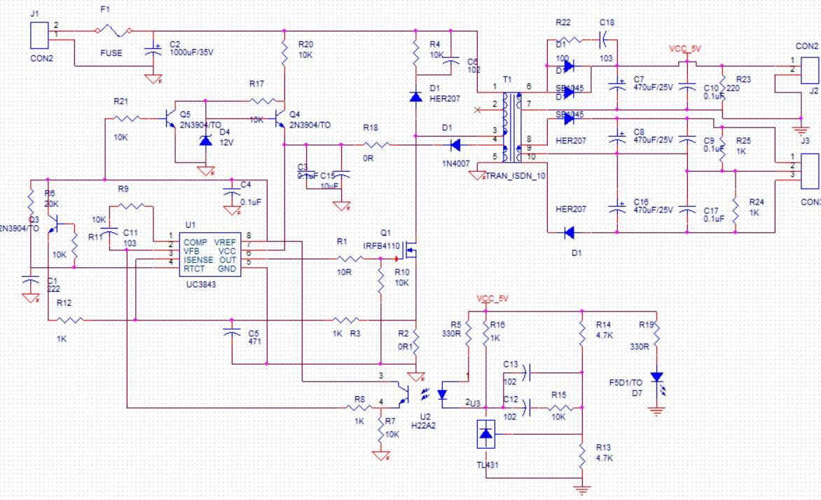 d1二极管负责把变压器的输出的脉冲电压整流成直流电压,串接在回路的电阻r18为了降低输出直流电压的波动性,通过c3电容滤波,给芯片一个稳定的工作电压,此处整流二极管和限流电阻R18选型取值要注意,在电源短路时要靠把此处电压拉低,较小到10V以下,这样开关电源就会进入反复启动状态,俗称打嗝状态,这样就不会产生大电流高电压,损坏电子元器件,当负载短路移除,电源又可以启动工作。