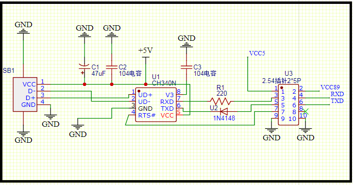 这是usb转串口下载的电路。这个使用的是CH340N芯片,不需要使用晶振,内置晶振,使用很方便,其中电阻和二极管是防止给单片机供电,造成单片机无法复位导致下载程序失败。