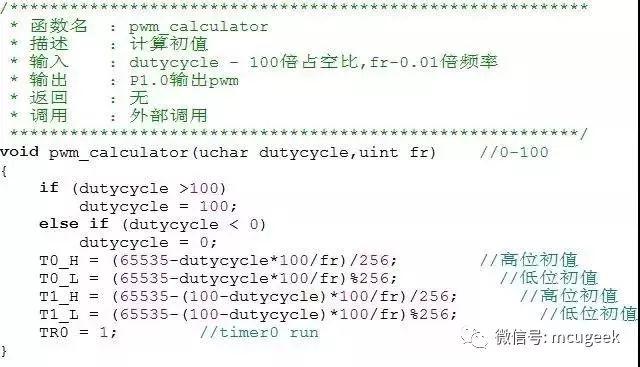 修改后的公式如下:a为100倍占空比,fr为0.01倍频率TH0 = (65535-a*100/fr)/256; //高位初值TL0 = (65535-a*100/fr)%256;同样,低电平的公式只需把a换成(100-a)即可。