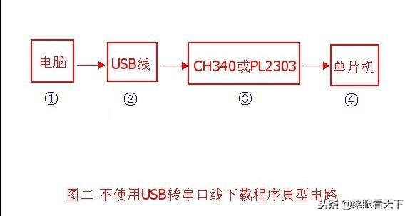 请看图二,这是我经常采用的单片机下载电路。实践证明效果非常好,几乎没出过任何问题!它的好处是只需要找根普通的USB2.0线(如图二中②)就可以下载了,比找根USB转串口线要轻松的多,同时由于将串口9针接口换成了USB接口,所以电路板的体积、重量也减少了不少,也显得更美观时尚,呵呵。在此强调一点:推荐使用CH340芯片(可以用CH340G,它引脚间距大很容易焊接)而不是PL2303,上文已说PL2303水货多,况且PL2303的外围电路比较复杂,这也给硬件电路的调试增加了难度。当然如果项目对成本特敏感,那么采用价钱相对较低的PL2303也无可厚非。大家看到没,图二的电路结构比图一要简化很多,那么是不是可以说明图二的性能比图一要更好呢?应该是吧!简单的结构出问题的概率当然更小了!