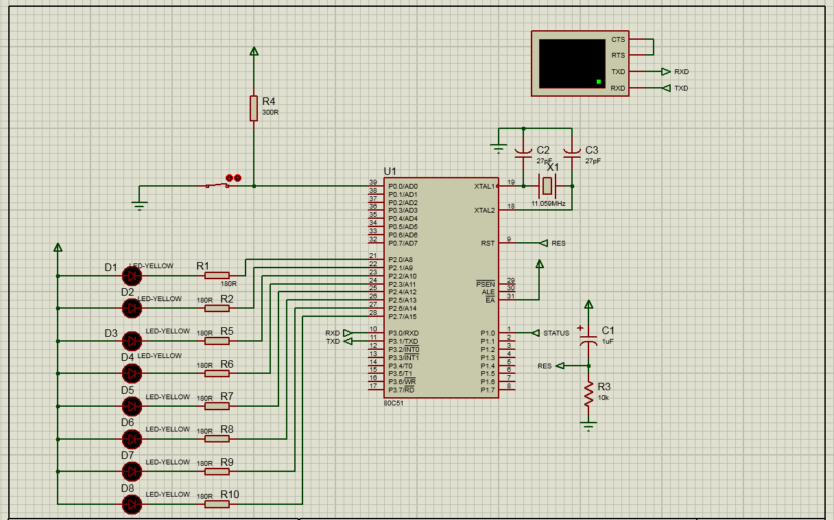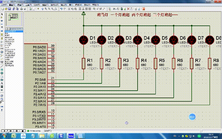 另外,它可以仿真51系列、AVR、PIC、ARM、等常用主流单片机。还可以直接在基于原理图的虚拟原型上编程,再配合显示及输出,能看到运行后输入输出的效果。配合系统配置的虚拟逻辑分析仪、示波器等,Proteus建立了完备的电子设计开发环境。下面用AT89C55单片机外部连接8个LED反光二极管,采用共阴极连接方法。当单片机管脚输出为0时,LED亮;当管脚输出为1时,LED灭。