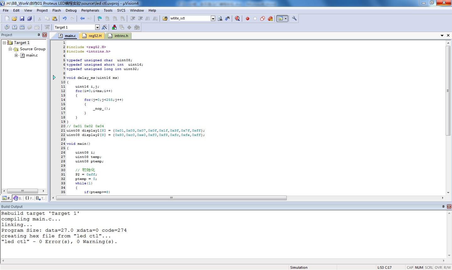 跑马灯需要一个延时程序,延时子程序调用delay(),然后单片机管脚在不同时段输出控制LED发光二极管,进行跑马灯的控制。以下贴上本次实验代码。欢迎讨论留言!