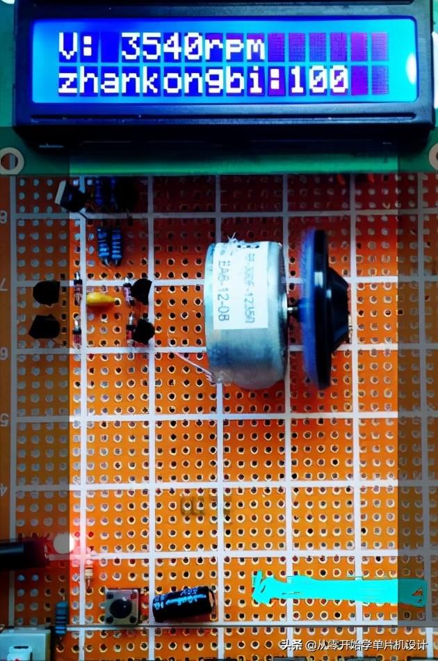 液晶屏第一行显示电机转速,第二行显示占空比,占空比数值越大,电机转速越快。