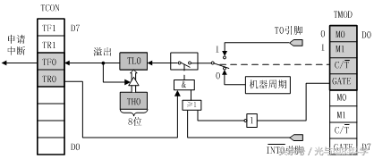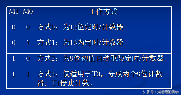 方式1为13位计数,由TL0的低5位(高3位未用)和TH0的8位组成。TL0的低5位溢出时向TH0进位,TH0溢出时,置位TCON中的TF0标志,向CPU发出中断请求。