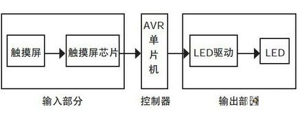 系统的总体框图如图1 所示。系统可有输入,输出,控制三部分组成,当触摸屏被按下触摸屏芯片读取触摸屏上X 轴与Y 轴的值,然后通过SPI 协议传送到控制器,控制器负责信号的处理,把处理完毕的信号以PWM 方式输出驱动LED。