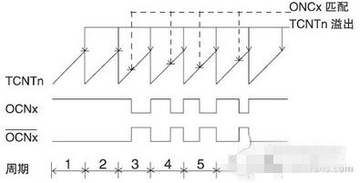 TCNTn 斜坡上的短水平线表示OCRn 和TCNTn的比较匹配。产生PWM 波形的机理是OCRn 寄存器在OCRnX 与TCNTn 匹配时置位( 或清零),以及在计数器清零( 从TOP 变为BOTTOM)的那一个定时器时钟周期清零( 或置位)。输出的PWM 频率可以通过如下公式计算得到: