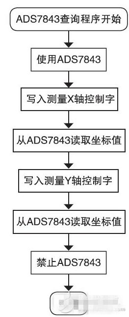 所谓的触摸点坐标是指当触摸屏被按下时触摸芯片读出的X 轴与Y 轴的数值。触摸坐标的读取时非常关键的,它是触摸屏使用过程中最重要的环节,若触摸点坐标有误,将导致单片机错误处理。首先使能ADS7843,然后向ADS7843 写入测量X 坐标的控制字,延时若干毫秒后,读取ADS7843 的转换数据。读取的数据即X 的坐标值;再把测量Y 坐标控制字写入ADS7843,延时若干毫秒后,读取ADS7843 的转换数据,就得到了Y 坐标的值,然后禁止ADS7843.这样既完成了一次读取坐标值的过程。其具体流程如图7所示。