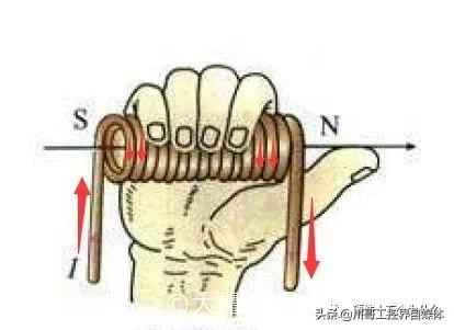 这个定则是通电线圈判断极性的基础,红色箭头方向即为电流方向。