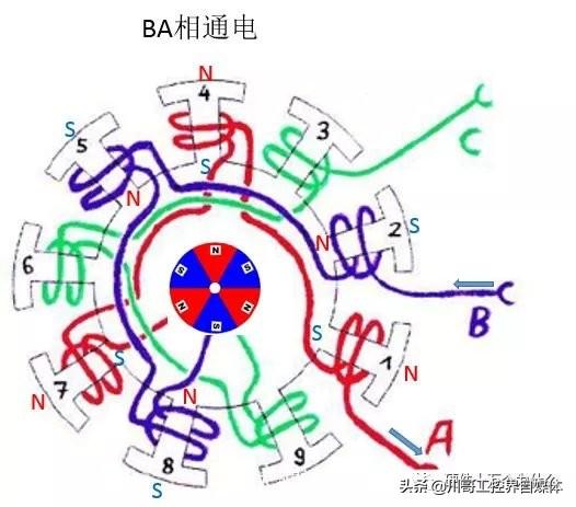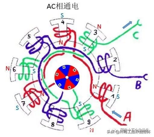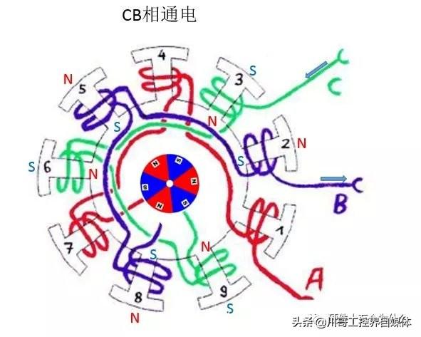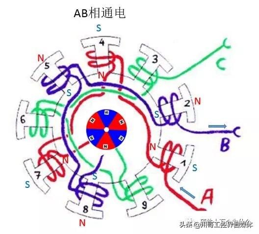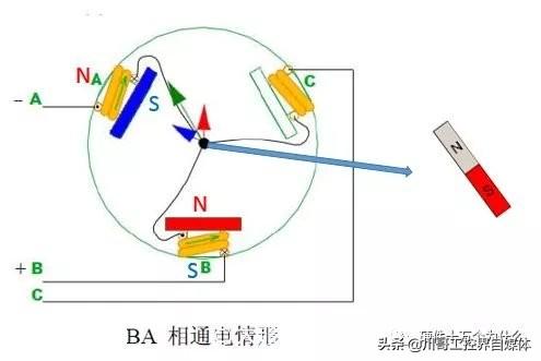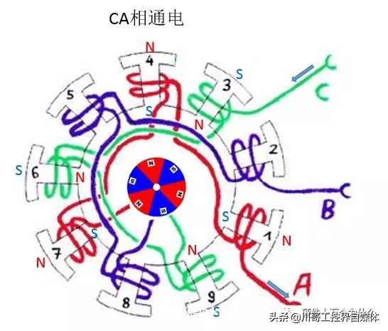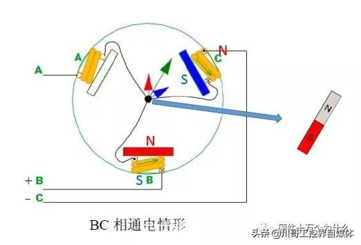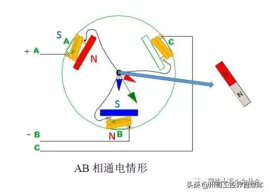 当AB相通电,则A极线圈产生的磁感线方向如红色箭头所示,B极产生的磁感线方向如图蓝色箭头所示,那么产生的合力方向即为绿色箭头所示,那么假设其中有一个二极磁铁,则根据“中间的转子会尽量使自己内部的磁感线方向与外磁感线方向保持一致”则N极方向会与绿色箭头所示方向重合。至于C,暂时没他什么事。