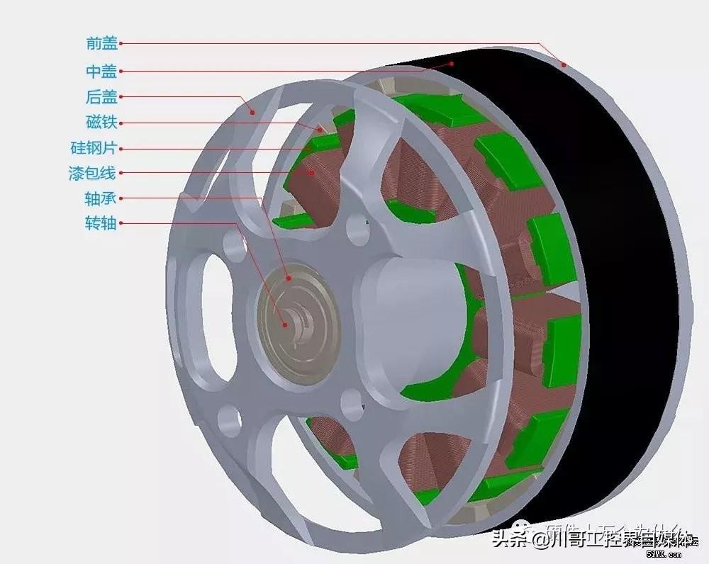 无刷电机的前盖、中壳、后盖主要是整体结构件,起到构建电机整体结构的作用。但是外转子无刷电机的外壳同时也是磁铁的磁路通路,所以外壳必须是导磁性的物质构成。内转子的外壳只是结构件,所以不限定材质。但是内转子电机比外转子电机多一个转子铁芯,这个转子铁芯的作用同样也是起到磁路通路的作用。