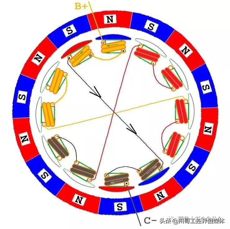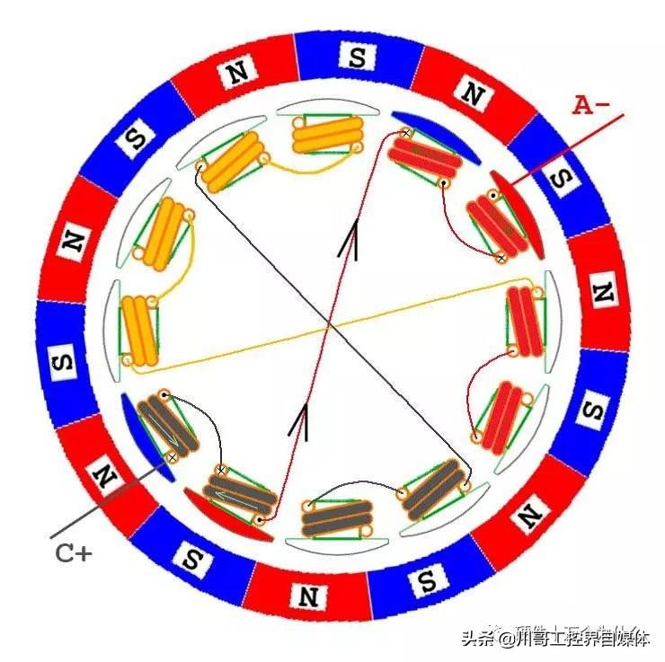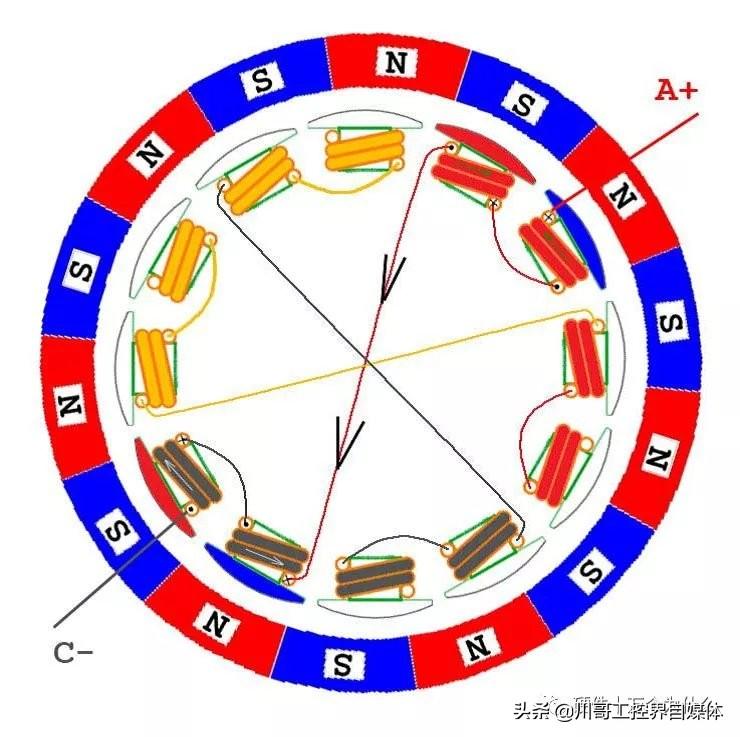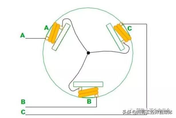 我们再来看一个复杂点的,图(a)是一个三相九绕组六极(三对极)内转子电机,它的绕组连线方式见图 (b)。从图(b)可见,其三相绕组也是在中间点连接在一起的,也属于星形联结方式。一般而言,电机的绕组数量都和永磁极的数量是不一致的(比如用9绕组6极,而不是6绕组6极),这样是为了防止定子的齿与转子的磁钢相吸对齐。