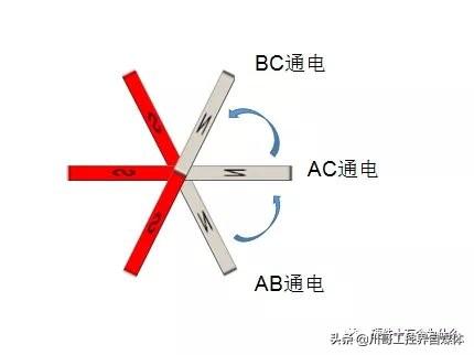 要说明一下的是,由于每根引出线同时接入两个绕组,所以电流是分两路走的。这里为使问题尽量简单化,下面几个图中只画出了主要一路的电流方向,还有一路电流未画出,另一路电流的具体情况放在后面进行分析,涉及到电路检测换相位置。